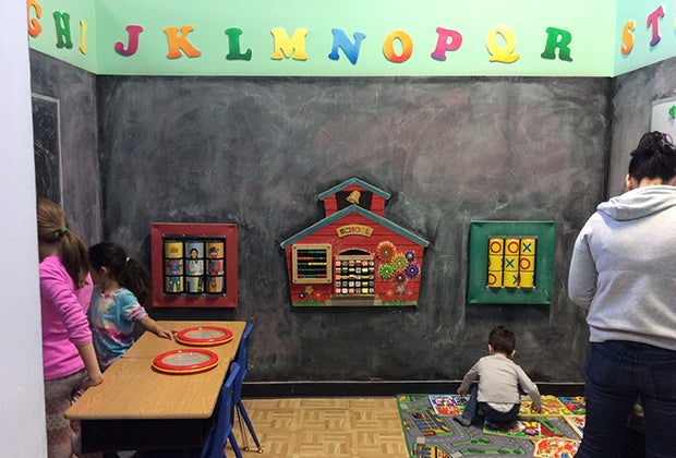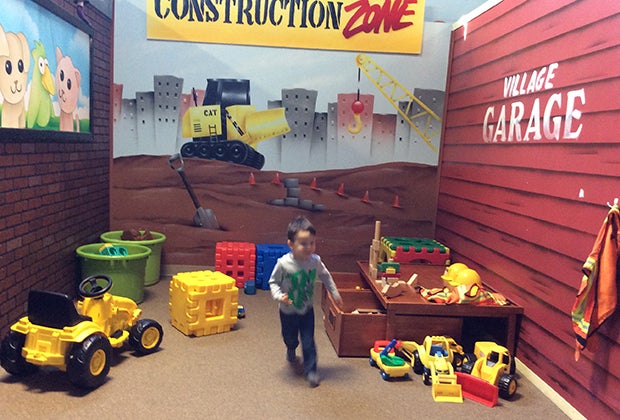 Pass inside a swinging white gate and a world of play suddenly becomes your child's oyster. The word that springs to mind when I think about this space is "thoughtful." Every detail — from the placement of trash cans to the benches located throughout where tired parents can rest — is mindfully planned out. The center of the room is lined with rows of seating that make it easy for parents to keep an eye on their children as they dart in and out of the various play spaces located on either side and separated according to theme and interest. I visited with my two-year-old son and five-year-old daughter and both were overwhelmed with joy when they caught sight of their play options: a pizza/bakery where kids can pretend to cook and serve meals, the village mechanic shop, a firehouse (complete with costumes, fire engine toys, and even boots), a Pet Shoppe where they can play veterinarian to an assortment of stuffed animals, a train room, costume shop, village grocery store, and — my personal favorite — the Dupont St. School, a brightly colored room outfitted with books, a blackboard, educational manipulatives for young learners, and a whiteboard filled with magnetic numbers and letters.