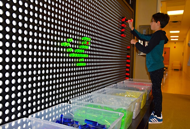 The illumination station, an 8-foot-wide lit pegboard, is really just a larger-than-life Lite Brite. Use lucite pegs in a back-lit board to create words, emojis or a colorful ROYGBIV rainbow.