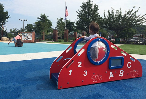 First, you have to love the location of this playground. Located right off of the community's vibrant Main Street, the park complex includes tennis and basketball courts, and a picnic area. There is plenty of metered parking in two separate lots just steps from the playground. The playground itself is fenced with one gated entrance. Parents with little ones who like to go discovering on their own will appreciate this security feature. Parents and kids also will like the rubberized safety surface as well as the realistic-looking artificial turf.