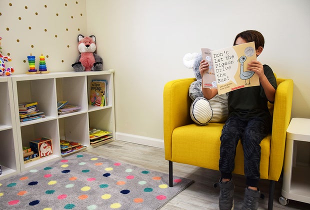 There’s a pretend kitchen and market, a Lego table—Duplos for tiny hands—a train table for budding engineers, a puppet theater for future thespians, and an indoor playground equipped with two slides. There's even a hidden “clubhouse” for important kiddie conferences. Is your child in need of some quiet time? There’s a cozy reading nook filled with books and puzzles. Pull up a pillowy chair or a piece of rug and have at it.
