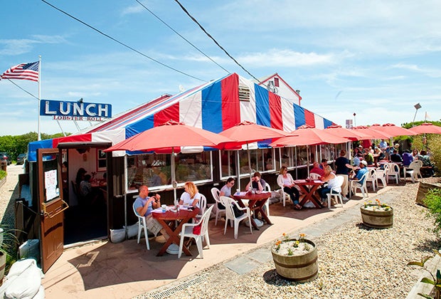 This iconic summer spot has been serving up lobster rolls for more than 50 years. The red, white, and blue awnings set the stage for a festive atmosphere, and the beach balls as whimsical decor add to the fun. Eat on the patio, inside at spacious booths, or at the bar. The friendly atmosphere makes this a great place to eat with a group. Don't be put off by the seemingly long line: Tables turn over quickly as most patrons stop for a fast bite and then continue on their way. With offerings for Land Sharks (hamburgers and hot dogs) and Sea Critters (fried shrimp or lobster salad slider), the kids' menu offers an array of options. End the meal with one of its famed fruit pies. Enjoy raspberry, strawberry rhubarb, and peach, just to name a few.
