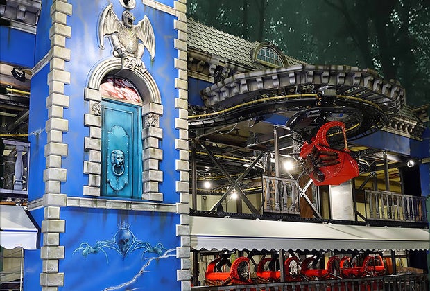 Mystery Mansion is restricted to riders 48 inches and taller. As guests sit in red, floorless ski-lift-style seats, they’ll travel through the many rooms of the mansion, where they encounter animatronics and special effects that can take the shape of skeletons, haunted piano players, werewolves, scary dogs, or funny clowns, all of which change from time to time.