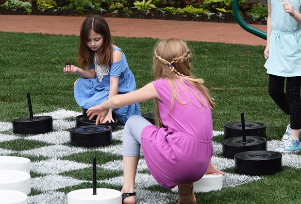Kids can enjoy a game of lawn checkers on the grass-like surface.
