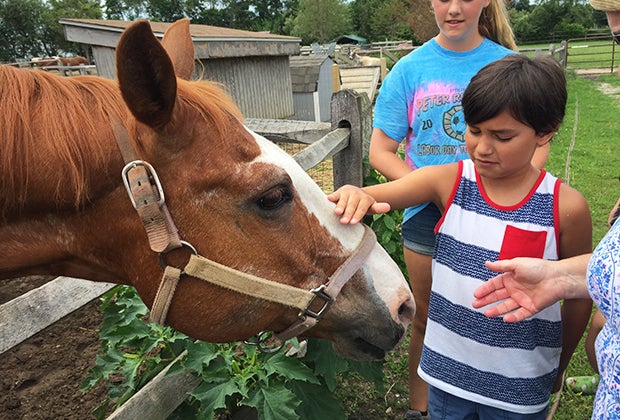 An early Saturday morning on the North Fork found my family turning to this equestrian oasis for an interactive and informative visit. Eloquent tween-aged volunteers led our farm tour. First, we made our way to the feeding barn, where our boys, ages 6 and 9, handled feed and learned about daily medication, dental care, and hoof maintenance. Bonus—we were able to handle some real horseshoes.