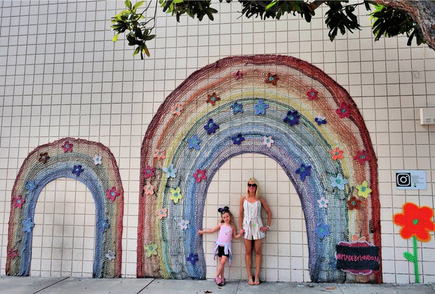 How about getting your child to pose under a pint-size rainbow alongside other happy little things? The "Rainbows Wall" (8050 Melrose Ave) features two crochet rainbows—one big and one small—as well as a peace sign and a patch of flowers.