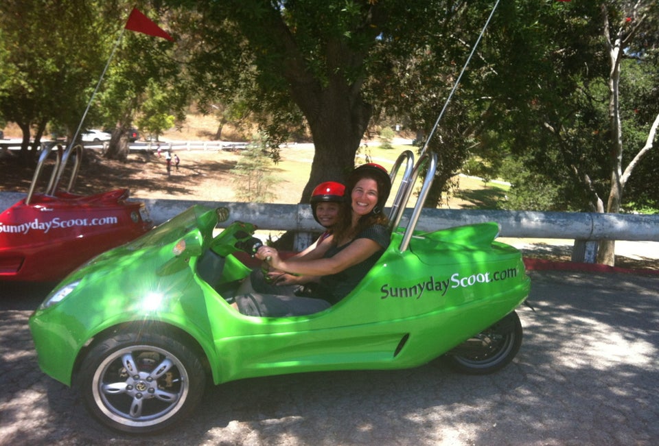I'm feeling pretty smug today. Not only did I take my kid on an outing in his hometown that thrilled him within an inch of his life; I also found an activity that was utterly and completely new to our LA team's native Angeleno, Jackie Stansbury. You may have noticed a recurring theme in Jackie's posts: unlike most LA parents I know, her childhood memories are actually all right here in the Southland. When she talks about a grunion run, she compares it to the one she did 40 years ago. In short, there's nothing new under the LA sun for her. That is, until today, when she and I were invited to do some scootering under the sun in funny little vehicles that feel like a cross between a bumper car and Colonel Klink's motorcycle. We took our kids on LA's newest road adventure: Sunny Day Scoots.