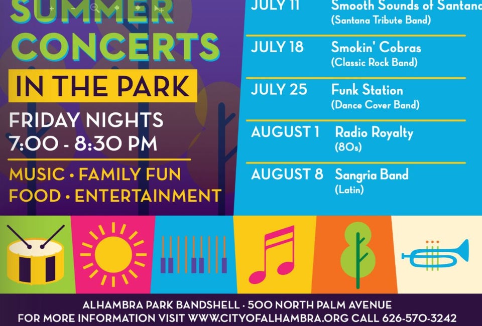 Alhambra's Concerts in the Park are held every Friday night in July at the Alhambra Park Bandshell. Families can enjoy a fun evening of music, food, and entertainment.