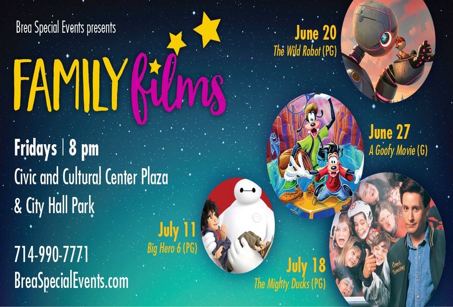 This year's family fun movies are shown at Brea Civic and Cultural Center. The selections include crowd-pleasers such as The Wild Robot and A Goofy Movie.