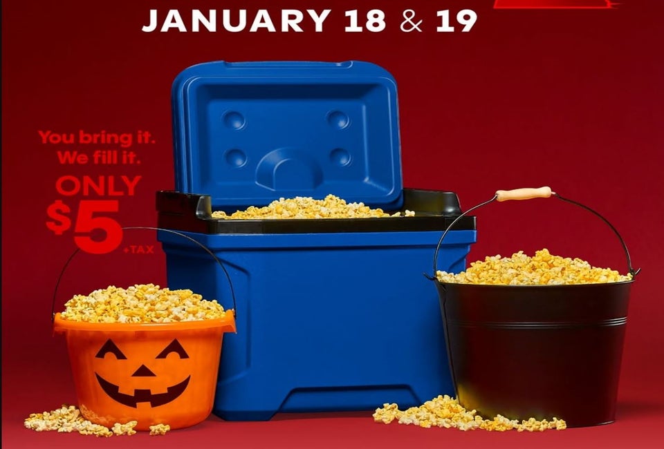 On National Popcorn Day, moviegoers can bring their own bucket or container to any Cinemark theatre, and get it filled to the brim with buttery popcorn for only $5.