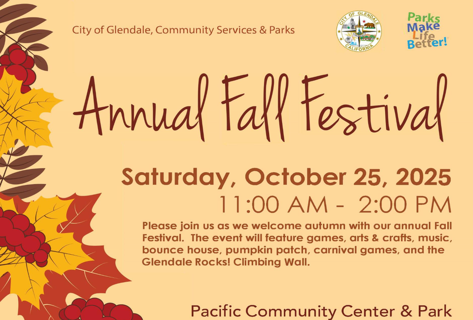 The event features carnival games, arts & crafts, a bounce house, a pumpkin patch, music, and the Glendale Rocks! climbing wall.