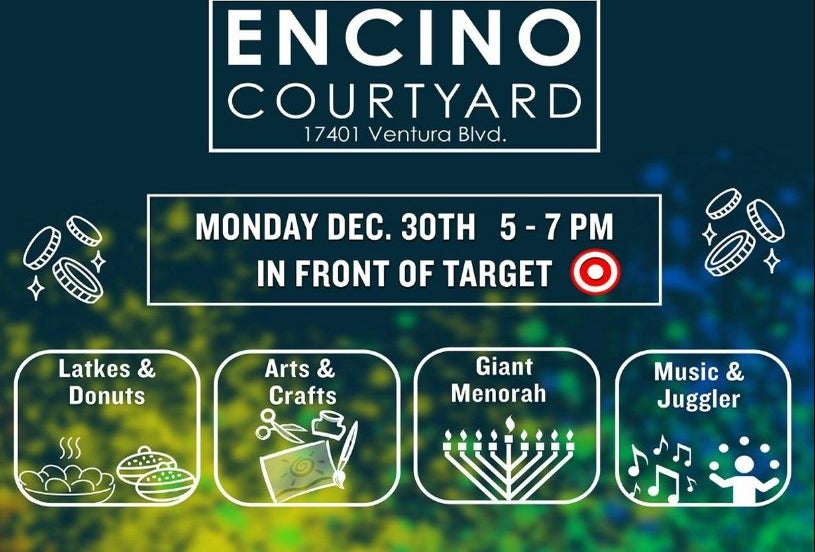 The menorah is lit at Encino Courtyard during the Chanukah on the Boulevard celebration, and guests can enjoy music, a juggler, and arts & crafts. Favorites served include donuts and latkes.