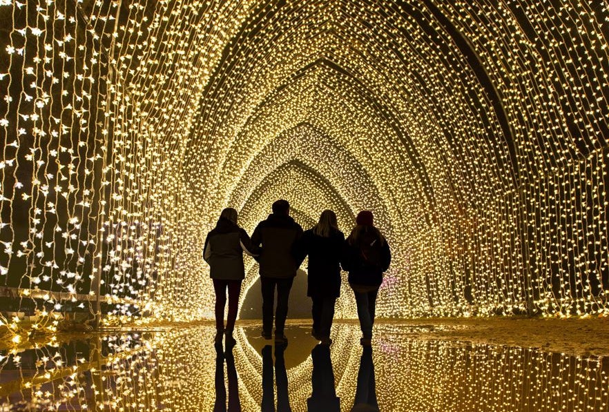 Visitors explore a festive world of wonder with thousands of twinkling lights in various installations; returning favorites include Winter Cathedral’s heavenly arch tunnel and Fire Garden’s dynamic glowing blazes
