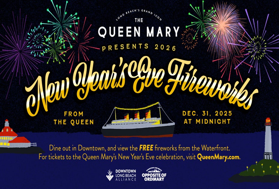 The skies over the Long Beach waterfront light up on New Year's Eve at midnight, with fireworks spouting off from the historic Queen Mary.
