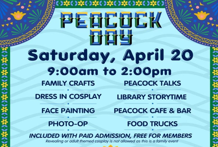 Guests can dress in peacock cosplay for activities such family crafts, face painting, photo-op, peacock talks, library Storytime.