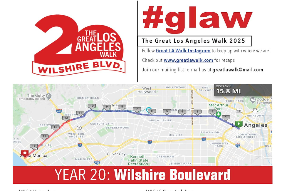 This year's route treks the length of Wilshire Blvd, starting at Pershing Square and walking west all the way to Ocean Avenue.