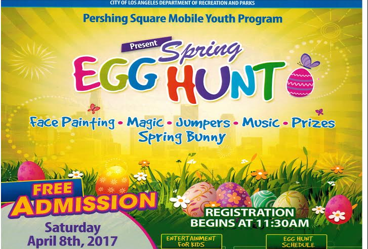 The Pershing Square Mobile Youth Program hosts its annual Extravaganza Spring Egg Hunt at Pershing Square. The event includes jumpers, magic and music, egg hunts, and a visit from the Spring Bunny (bring your own camera for photos).