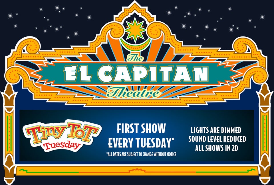 The El Capitan Theatre hosts very special Tiny Tots Tuesday screenings of current releases. Designed for the youngest fans, these early morning screenings feature lights that are dimmed rather than completely off, and reduced sound levels.