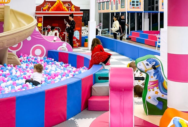 All the ladders, climbing spaces, slides, and tunnels are easy to scale, even for the littlest legs. My two-year-old loved exercising independence by climbing to the top of a play structure, rocketing down a pink spinny slide, and crashing into a ball pit. She wiggled up to a trampoline and bounced to her heart’s content. She rolled and rollicked in the large ball pits, tossing the pink and white spheres in the air, squealing and giggling. She repeatedly hopped on the slowly moving carousel, waving as she spun into my eyesight.