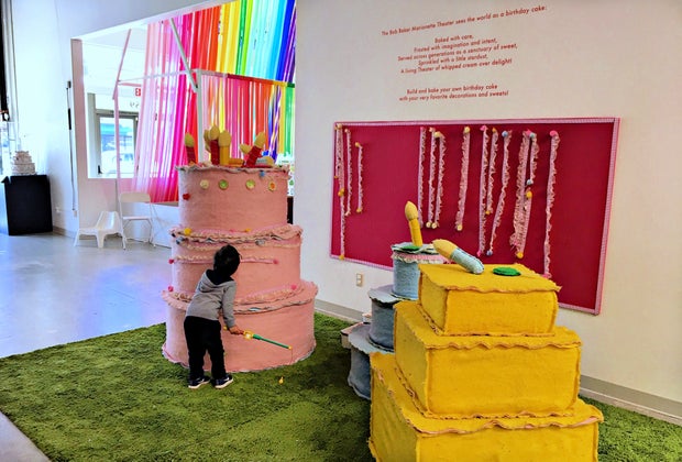 The huge open space has no dividing walls and blends sensorial play-based areas with interactive exhibits suitable for babies, toddlers, and kids up to eight years. Designed to spark wonder, SCCM’s current performing and visual arts installations invite children to experiment, explore, and create. There’s one dedicated to the magical world of LA's classic Bob Baker Marionette Theater: a few glass cases containing vintage puppets line the brick wall, but the real centerpieces are several marionettes of different shapes and sizes that young puppeteers can handle—including Rufus, a giant puppet connected to thick ropes which visitors can pull to make him move. Children have the opportunity to garnish three larger-than-life stackable birthday cakes with felt decorations and sweets, too. My son had a blast not only decorating, but rolling a tier of cake around the floor with some pint-sized partners in crime.