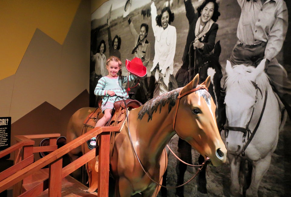 The Autry Museum's youngest visitors can enjoy dressing up and playing pretend in the Imagined Wests exhibit. This exhibit features a play barn and farm house filled with props and costumes, along with a play movie camera. There's also a mock horse in front of a green screen where kids can watch themselves "riding along" in a western film, alongside John Wayne.