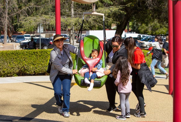This addition is the highlight for my kids. Prior to the renovation in late March, Shane's Inspiration did have one zipline, but it was small, old, and creaky. Now there are two zipline tracks—one with a seat and one with a rope swing. I swear my girls could do this all day!