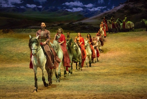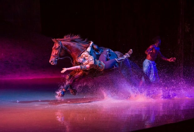 The costumes suggest a tribe of ancient and majestic gypsies, or maybe nomadic Cossacks, whose camp followers seem to be a troupe of euphoric acrobats from a distant land. For each gypsy princess on horseback who sails high over a fence, a bounding, flipping acrobat leaps even higher. I confess I grinned from ear to ear from start to finish, not just because the show is so utterly beautiful, but because everyone on the stage—human and animal alike—seems to be having so darn much fun.