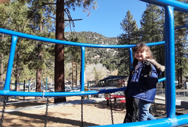 We love to visit Wrightwood when there's snow, and we found just the perfect place where you can go play with lots of it, and for free. For small children, I recommend the Apple Tree Campground. It has well-groomed small slopes and open spaces—and the great thing is you can also bring your own sleds. Remember to buy the Adventure Passes for parking, which you can buy at the Mountain Hardware Store, at the Grassy Hollow Visitor Center, Jensen, and Wrightwood Mini Mart.