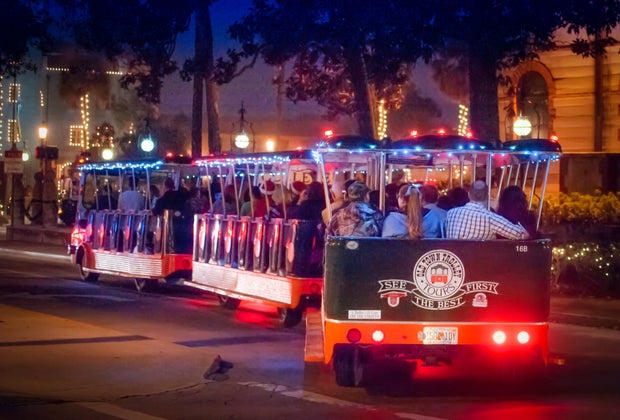 Enjoy a trolley ride around the Old City of St. Augustine during Nights of Lights. Photo courtesy of FloridasHistoricCoast.com