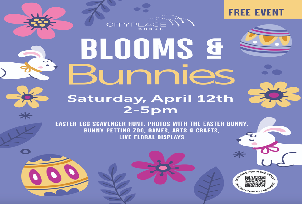 Hop on over to CityPlace Doral for its Blooms and Bunnies Easter event. Enjoy a day of egg-cellent activities at the Fountain Plaza, including an egg scavenger hunt at participating retailers, an all-bunny petting zoo, live music, a game zone, arts and crafts, face painting, free digital photos with the Easter Bunny, and a live floral display for photos.