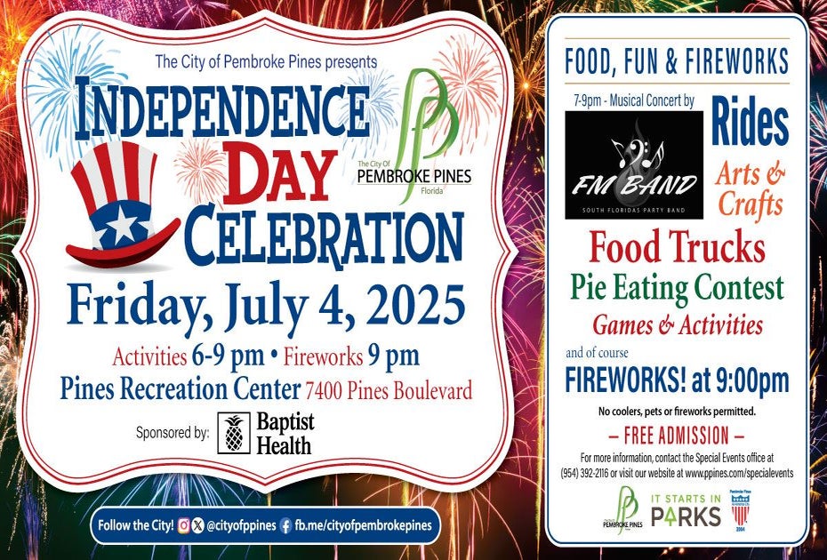 Celebrate the Fourth of July with the City of Pembroke Pines. Enjoy an evening of celebration, live music, rides, arts and crafts, food trucks, a pie-eating contest, and a fireworks show at 9pm.