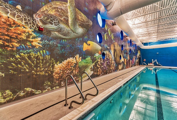 The decor here also keeps kids engaged. A fun sea life mural with porthole windows that look like rising bubbles flanks the pool. Fish tanks and other aquatic touches, including a winding waterway with bridges to cross, also make the space unique.