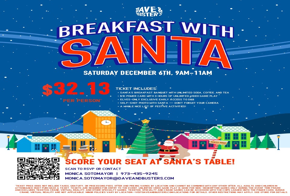 1. Santa Ticket: Santa’s breakfast banquet with soda, coffee, tea, & assorted juices, $10 Power Card with 3-hrs of Unlimited Video Game Play, personal photo with Santa, merry and bright activities, taxes, and a suggested 18% gratuity.