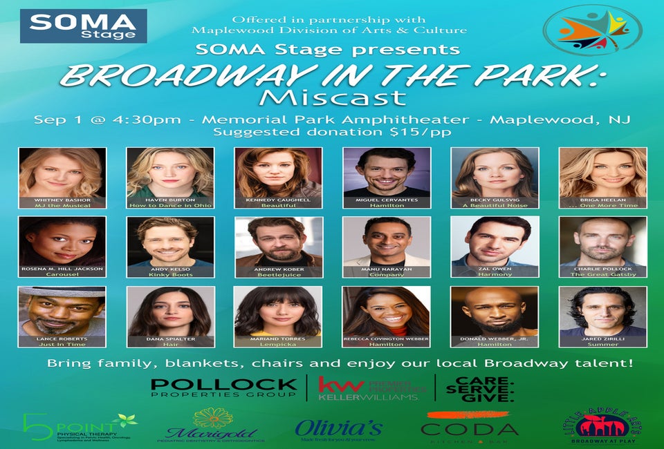 SOMA Stage, in partnership with Maplewood Arts and Culture, presents Broadway in the Park at the Memorial Park Amphitheater. This year's local performers are Miscast, turning the tables and singing songs from roles they would never traditionally play.