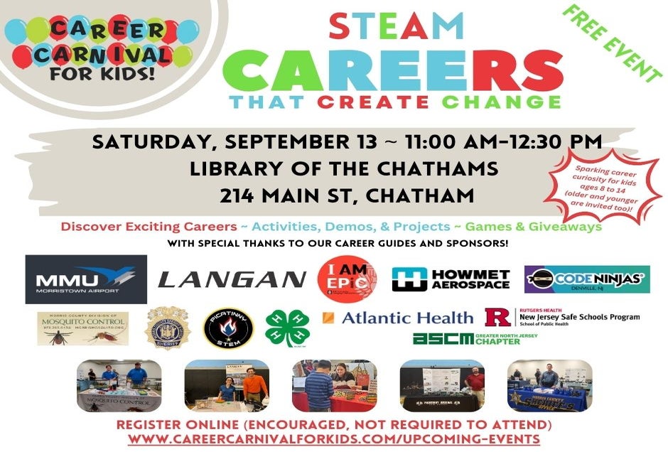 Kids ages 8 to 14 (older and younger also welcome) meet returning favorites from AIA NJ EPiC, Langan, MMU Morristown Airport, Morris County 4H, Morris County Sheriff's Office, Morris County Mosquito Control, and Picatinny STEM, as well as new Career Guides from the Association for Supply Chain Management, Code Ninjas - Denville, Rutgers NJ Safe Schools Program, and more.