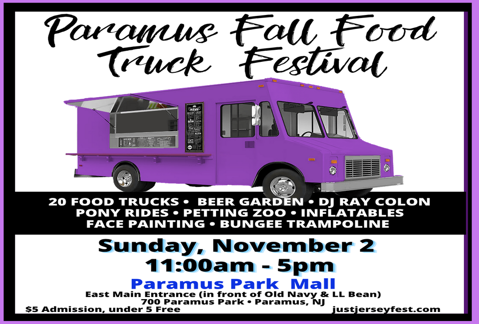 Paramus Fall Food Truck Festival welcomes scrumptious creations from 20 gourmet food trucks, plus DJ Ray Colon, beer, margarita and sangria garden, kids' activities, bungee trampoline, rock wall, pony rides, petting zoo, face painting, miniature golf, sand art, knockerball, bounce house, slide, vendors and more.