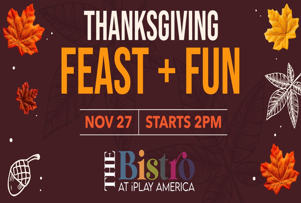 Join iPlay America for an unforgettable Thanksgiving experience. iPlay America and The Bistro are teaming up for a special all-day offering. First, have a classic Thanksgiving dinner with your family at The Bistro. Featuring turkey, traditional sides, and homemade dessert pies.