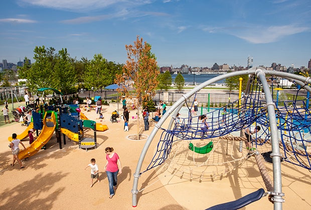 Newport Green Park in Jersey City has a playground, splash pad, carousel, and even a beach. Photo courtesy of Newport Green