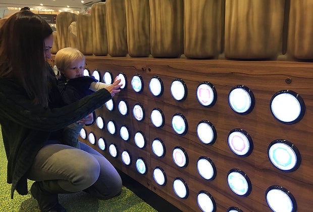 Before walking in, my friend held my son in front of the huge interactive fish tank so he could watch the fish and the bubbles float across the screen. The colors and the flutters of the little ocean creatures and flexible reef completely entranced him, and he immediately started to reach out to try to connect with his lifelike, finned friends. The screen had cameras above it, suggesting that there was a motion-activated feature. Had it been working (or perhaps simply turned on), my mini mister might have been able to coax the fish from one side of the screen to another with just a wave.