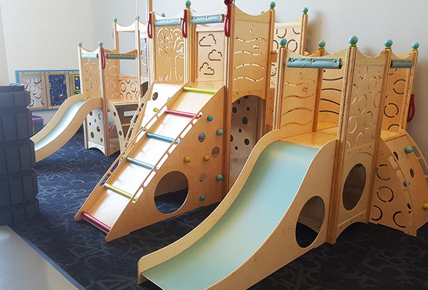 With its sleek modern design and cool color palette, Kidoolo has a decidedly chill vibe. Indeed, the gorgeous gray walls, low-to-the-floor ottomans, and silvery metallic poufs may remind you of trendy hotspots you frequented pre-kids. But here, instead of checking your ID and forking over a wad of cash for a night on the town, you fill out a waiver and pay a significantly smaller fee—$15 per child—for open play (adults get in free). High ceilings give the 5,500-square-foot space an industrial presence, but homey touches, like a rustic wood sign that greets guests with a friendly “hello," help to soften it. A bar area in the center of the floor allows adults to enjoy a sip of sparkling water or a small snack (prices range from $1-2) without taking their eyes off their kids.