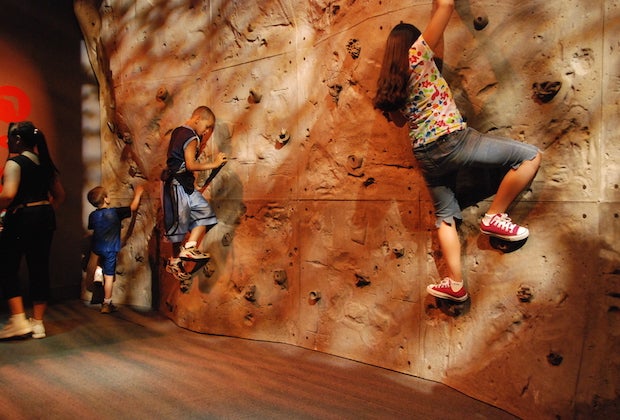 Top image: Rock climbing wall complete with fossils to find. Photo courtesy of the Liberty Science Center.