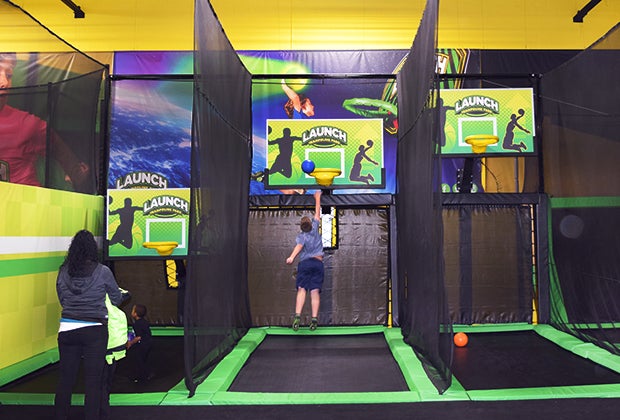 Launch’s ticket system is interesting. You’ll pay by the half-hour ($15 for 30 minutes, $20 for 60 minutes), and you'll get a color-coded wristband that enables you to jump at a specific time. Entries onto tramps happen every 15 minutes, and you can reserve a specific time slot in advance online. (Non-jumping chaperones are free, but they still need to sign in.)