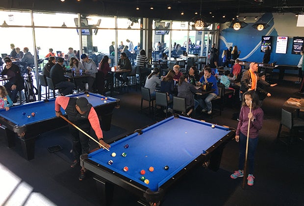 Knowing that kids need diversions when wait times for a bay can top two hours on busy weekends and holidays, Topgolf has equipped a downstairs lounge with two pool tables and shuffleboard, plus wired TVs for Xbox Kinect, alongside tables with food service and several highchairs. A second-floor waiting area near the large bar features foosball and another Xbox console. In warm weather, a rooftop deck bar will offer even more seating.
