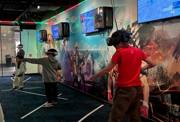 For a recent family night out, we headed to Oasis VRX in Holmdel, which has one of the broadest arrays of VR offerings that I've seen. We started in the free-roaming arena, which allows groups to play games together in a virtual world of sorts. We donned our fancy headsets, grabbed our hand controllers, and picked three experiences to try: fighting virtual pirates, protecting a prized gem from invaders, and frantically building burgers for a busy restaurant.