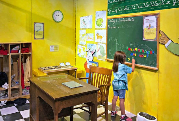 While my son is still a few years away from pre-K, a school setting really seemed to excite him. In Mr. Ratburn’s homeroom, kids can put away their belongings in adorable cubby holes, stow personal items and school assignments in their desks, and practice their script on the large chalkboard. Cursive still counts for something, right? The interactivity of the exhibit is probably most alive in this area, because not only can kids take on the role of student or teacher, they’re encouraged to think on their feet. I overheard one mother asking her six or seven-year-old daughter why she thought there “might be a problem” as they rummaged through items inside one of the desks. Turns out one of Arthur’s friends had received invitations to two birthday parties planned for the same date, and had to decide what to do. It was great to see problem-solving activities that coax children to think outside of the box and search for creative solutions.