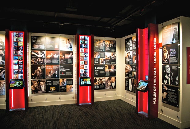 Costume exhibits highlight iconic wardrobe choices from past GRAMMY ceremonies: Remember Jennifer Lopez's bombshell green Versace gown? See it up close here. How about Kanye West's red-and-white marching band uniform from his 2006 performance of Gold Digger with Jamie Foxx? Or Coldplay frontman Chris Martin's colorful, military-style leather jacket?
