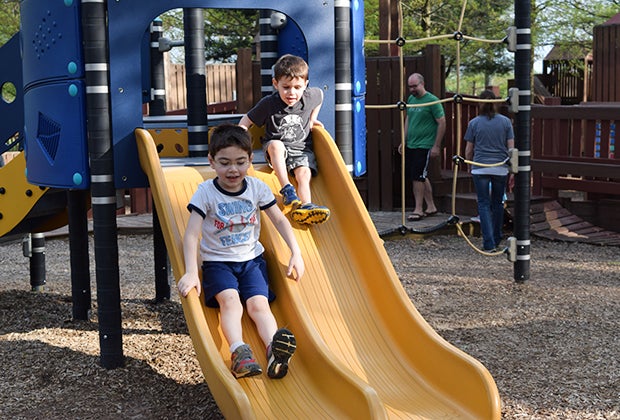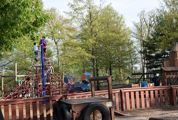 Expect older kids and tweens to bolt to the back of the playground, where they can try a small obstacle course and longer zip lines. Climbing fans will love the large hexagonal climbing area and a tall, web-like structure.