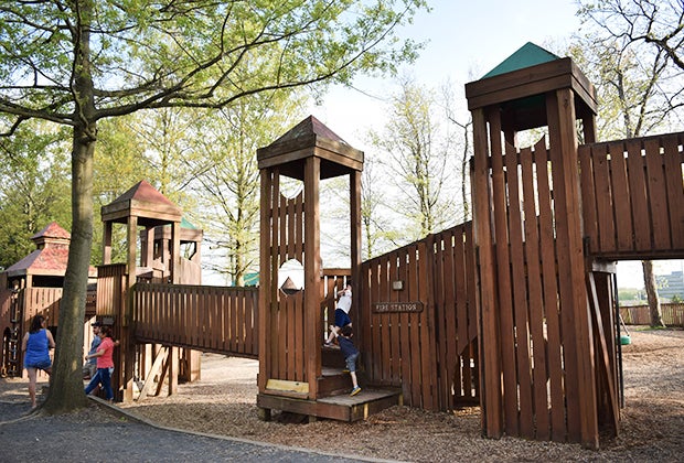 Across from this area is a section that’s perfect for kids ages 5 and up. There’s an enormous wooden climbing structure with a police station, jail, wooden cars, and more—all with interconnecting tire climbs, slides, and bridges.