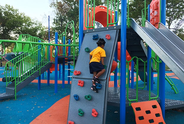 The recently renovated Grove Park playground features tons of cool climbing equipment. Photo by the author.
