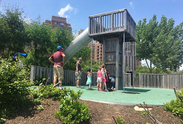 The focal point is a very long and steep tin slide that has a tree house–like vibe. Instead of stairs, climb the tree stumps to get to a narrow wooden shaft where kids have to use vertical toeholds to reach the top of the slide. My athletic and adventurous 4-year-old found this to be very difficult to do on her own, until an older kid kindly offered to help. However, she declined to venture up again for a second ride.