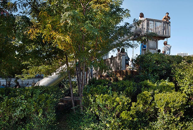 Located at the center of the pier, surrounded by raised grassy banks and shady trees, the toddler play area was much more my daughter’s speed. The slide here is short and sweet, and she enjoyed riding it over and over again. Another sweet treat is the adorable red-and-blue Kompan ice cream hut, which offers shade and role-play opportunities as well as a miniature four-seater seesaw that's perfect for multiple pint-sized riders.